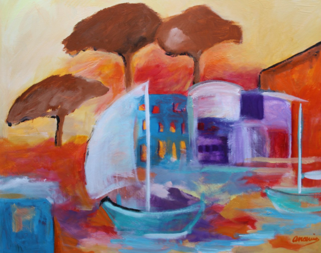 Het schip zeilt de haven binnen. Abstraheerd geschilderd op doek met acryl.