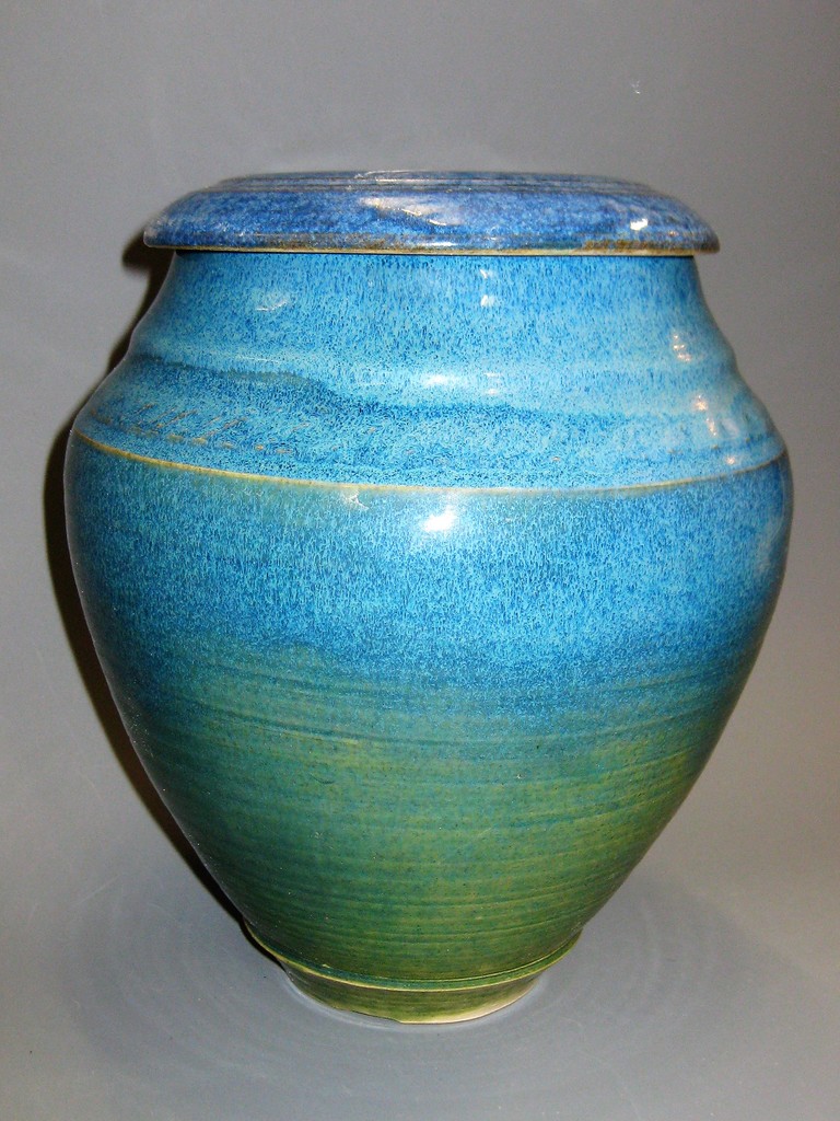 Prachtige blauw/groene urn. Onder groen en naar boven toe blauw met blauwe deksel. Ambachtelijk gedraaid en voorzien van eigen glazuur. De inhoud is 2,5 liter. Op 1250 graden gestookt dus ook geschikt om buiten te zetten