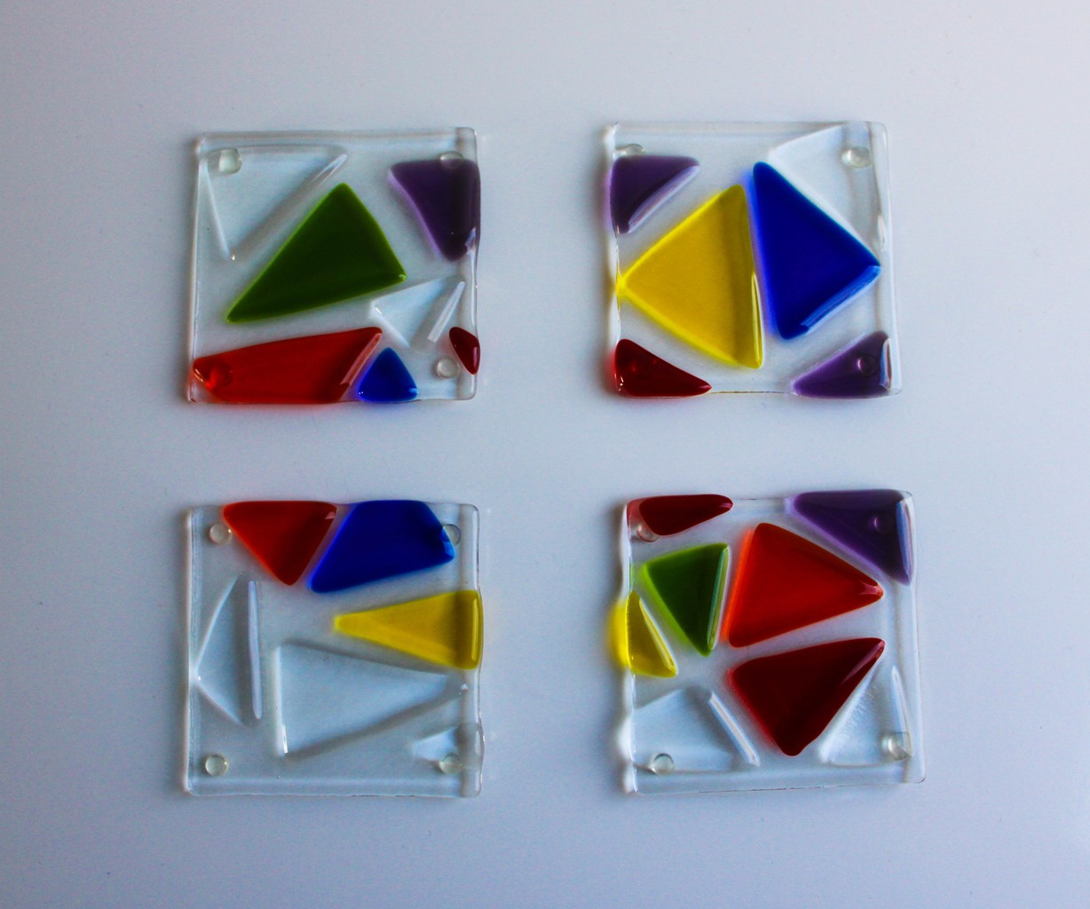 Glasversmeltingstechniek, onderzetters (8 x 8 cm) gemaakt in de kleuren van het logo van een onderwijsinstelling, kerstgeschenk