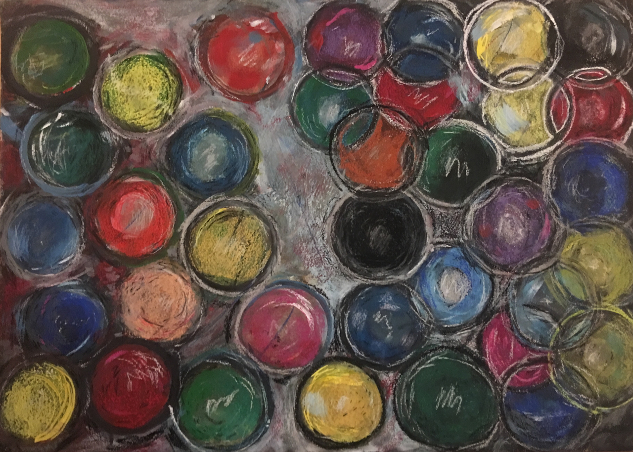 Ik heb van uit mijn fantasie gewerkt. Ik had een idee over ballen of bubbels die van de éne naar de andere kant bewegen. sommige zijn bubbels andere ballen ( knikkers ).