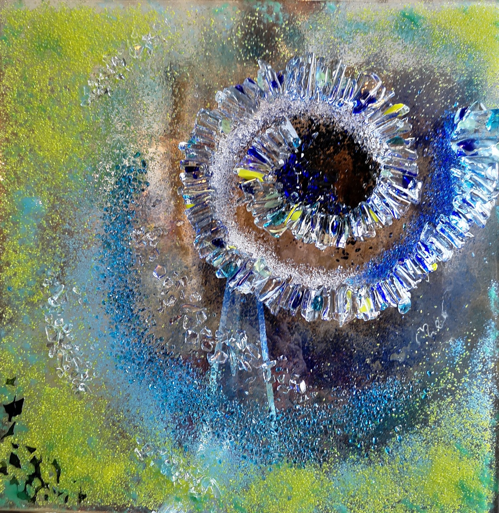 Muur/raam object of losstaand item. Groen/blauwe kleuren voeren de hoofdtoon. Doorzichtig en gekleurd opstaand glas schitteren als kristallen in het licht.