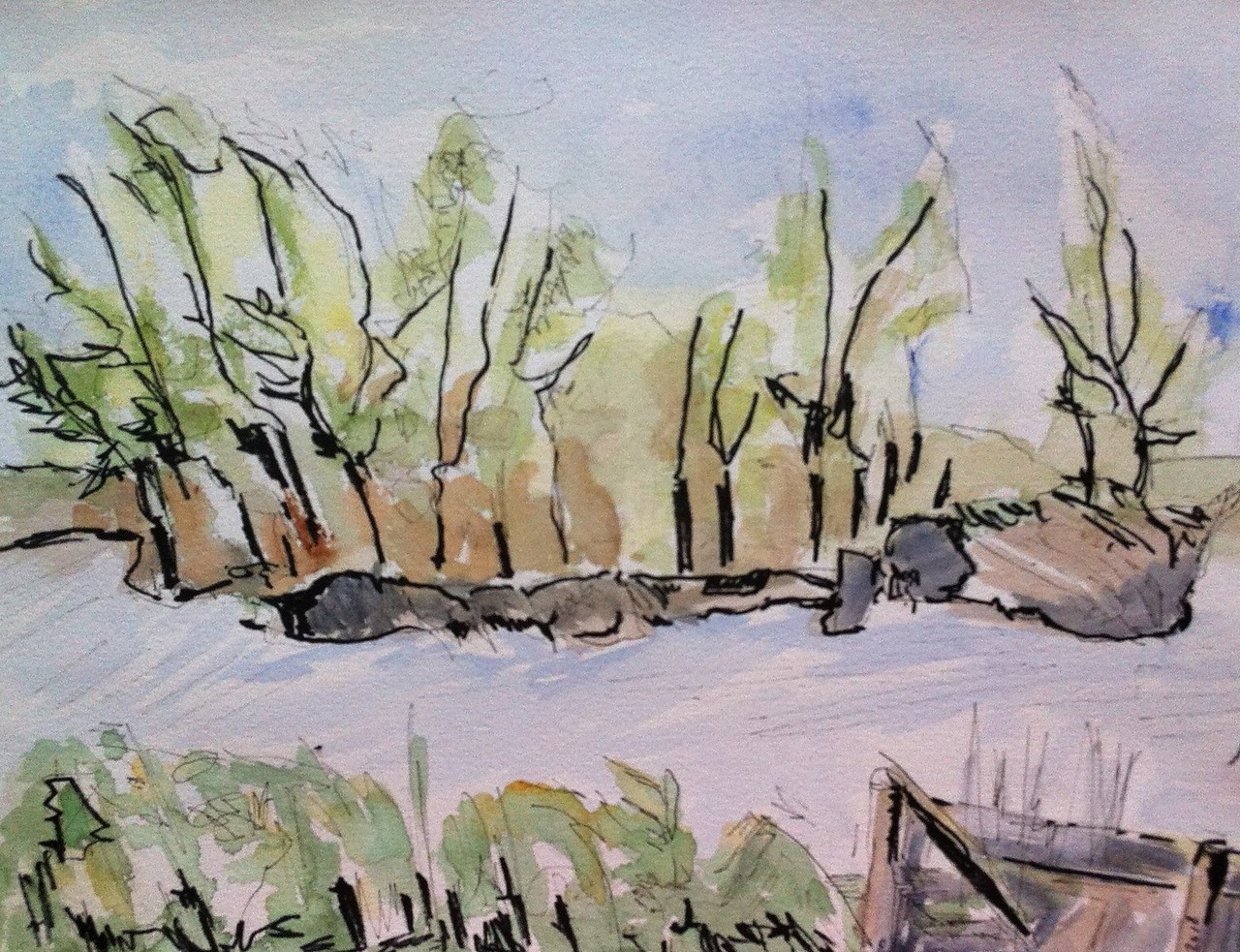 met viltstift de donkere plekken aangegeven, verder uitgewerkt met aquarelverf