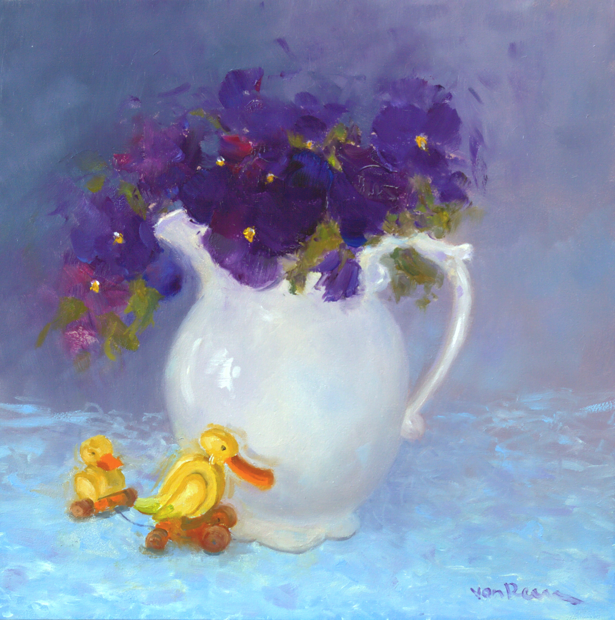 Geel Blauw Bloemen Stilleven Kan Viooltjes Houtenspeelgoed