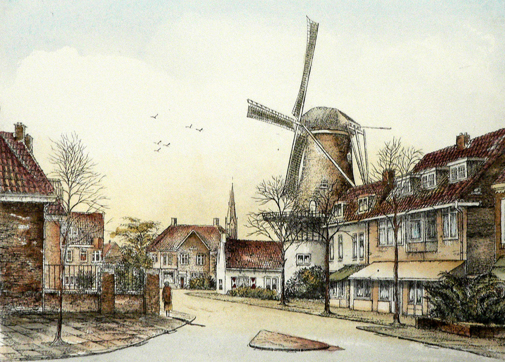 Molen 'de Windlust' in de Gravestraat met oude postkantoor.