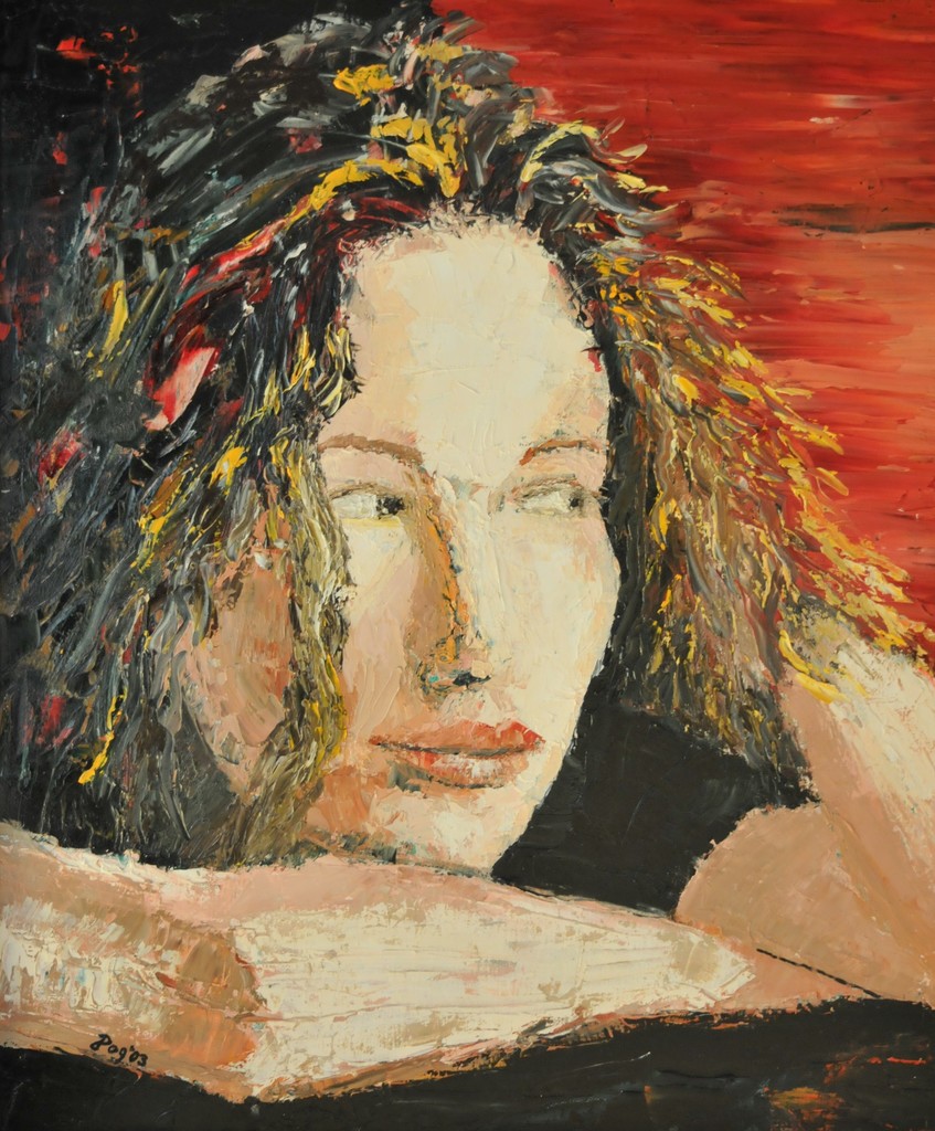 Verlangend op de bank hangend, nieuwsgierig of vriend lief vandaag nog langs komt. Olieverf met paletmes, september 2003.