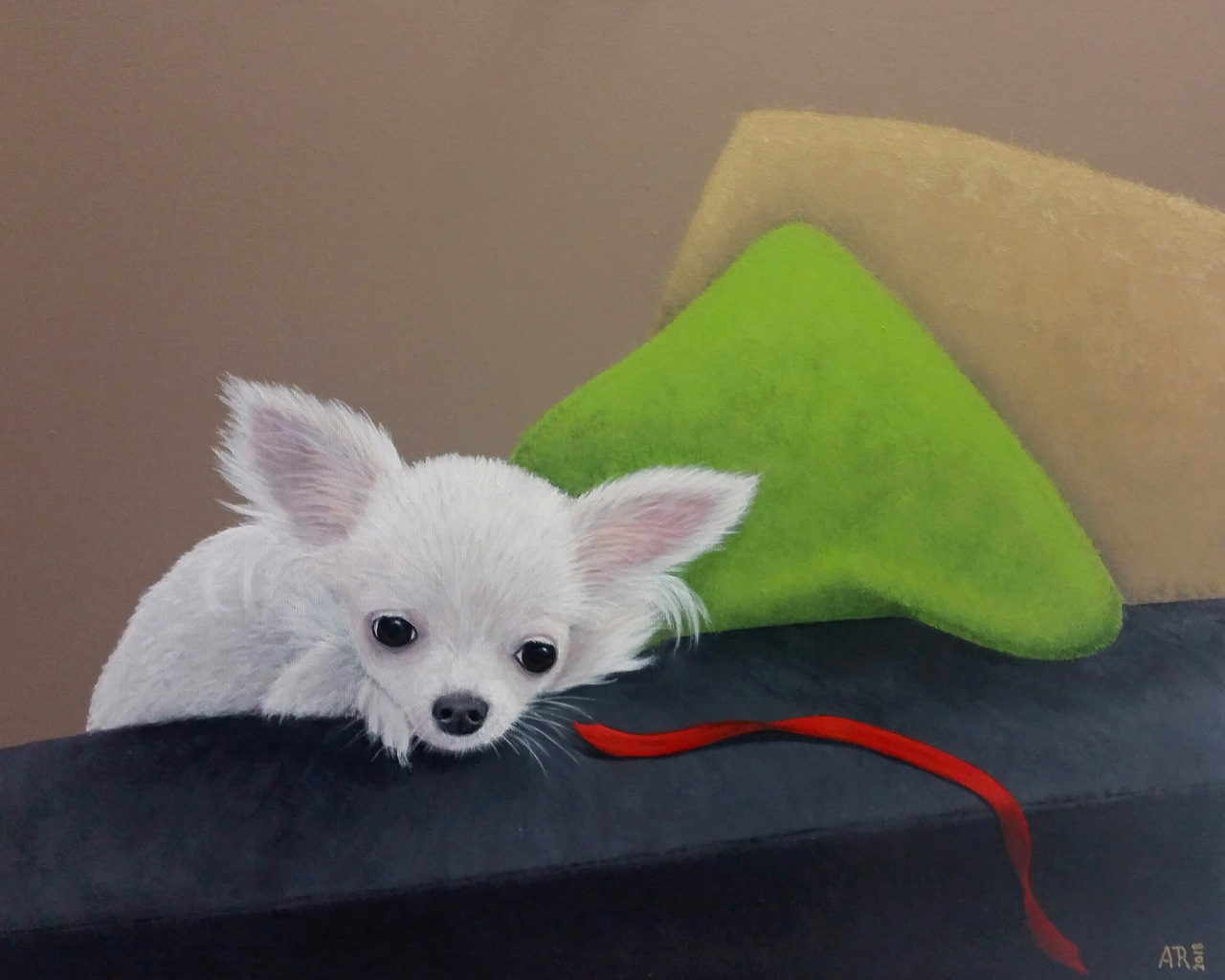 HD18-003 Dit schilderij van het overleden hondje was een cadeau van collega's van de eigenaar bij zijn afscheid van het bedrijf. Zijn reactie: