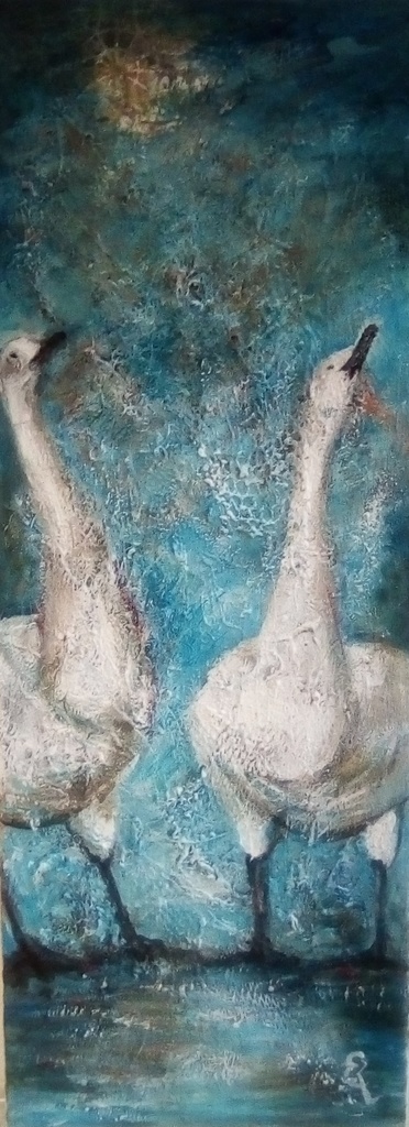 Wit Blauw Acryl Groen Mixed Media Dier Abstraherend Gans