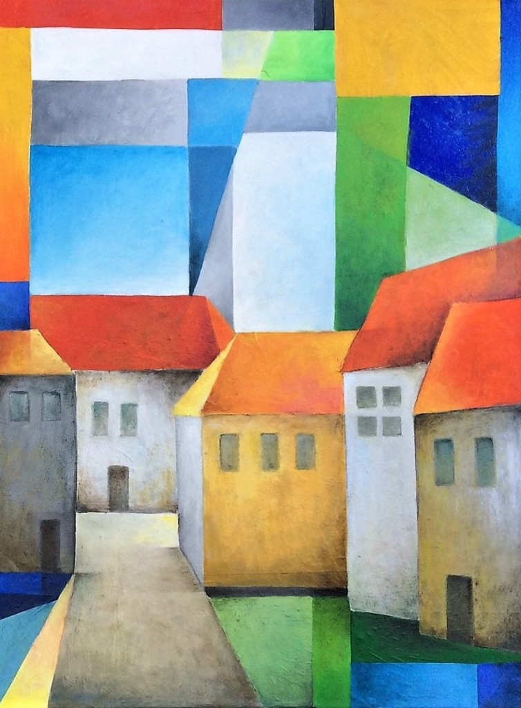 Geabstraheerd Olieverfschilderij Collage Huizen Veelkleurig