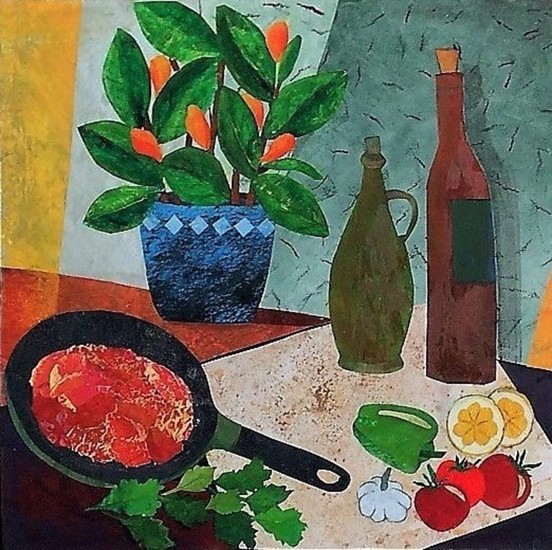Kleurige collage van voorbeschilderd papier op doek, betreft het onderwerp eten. Onderdeel van een tweeluik. De maat is inclusief witgeschilderd pass partout 60x60cm.