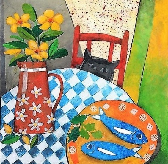 Veelkleurige collage van voorbeschilderd papier op doek. Onderwerp eten. Onderdeel van een tweeluik, maat inclusief wit pass partout 60x 60cm.