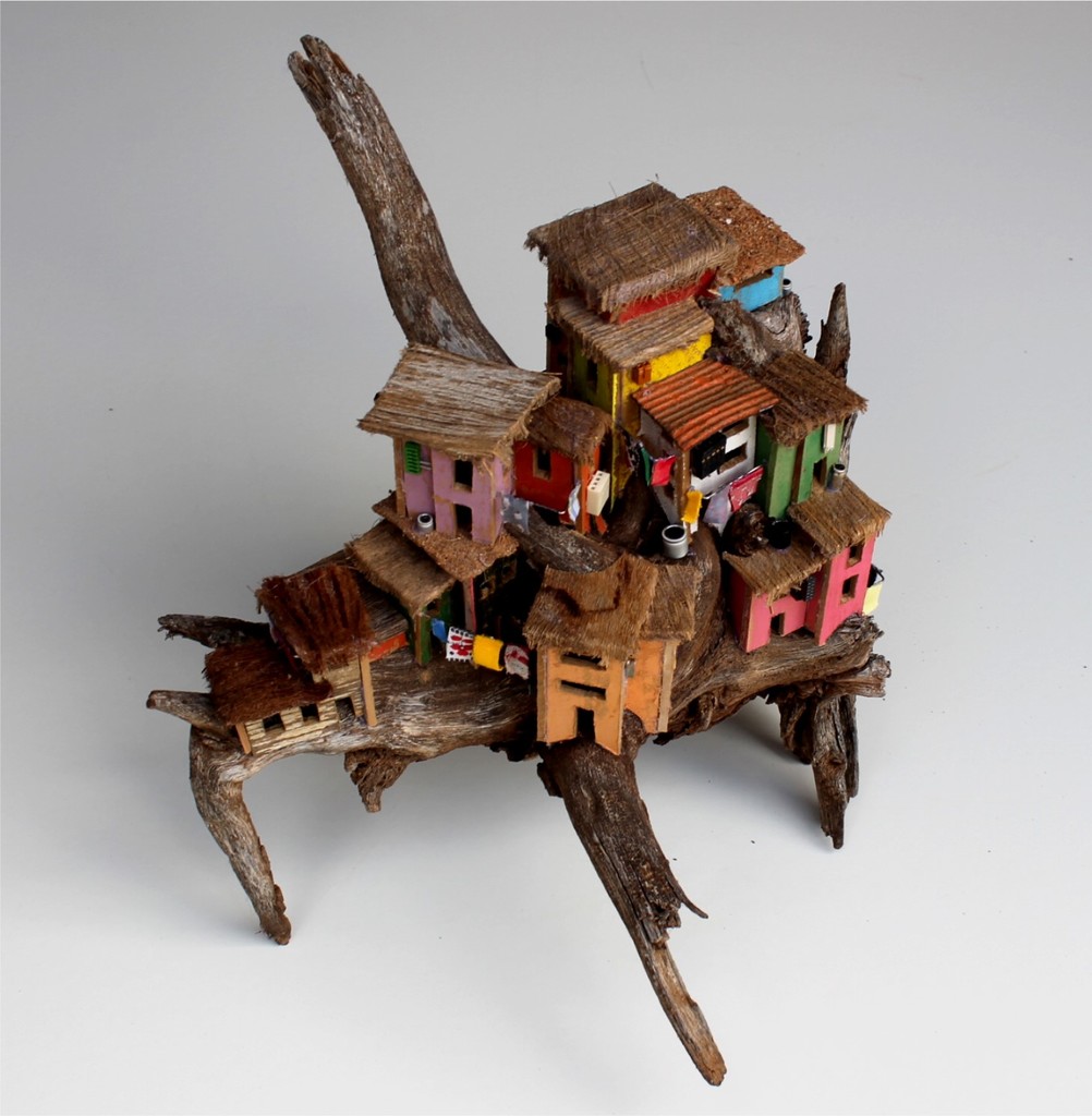 Worteldorp, mixed media, 34 x 34 x 34 cm. Zelden maak ik nog driedimensionaal werk maar deze keer kon ik de schoonheid van het stuk hout gewoon niet weerstaan. Verkocht