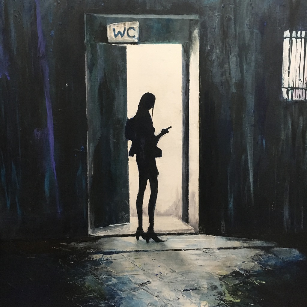 Vrouw in de deuropening van de toiletten, wachtend en op haar smartphone kijkend.