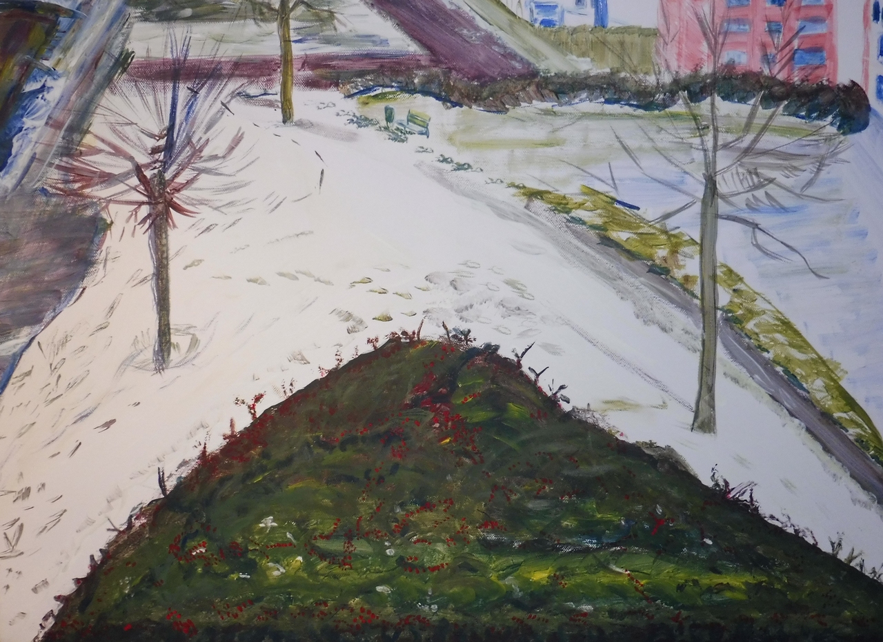 Het uitzicht vanaf mijn atelier vereeuwigd, want de sneeuw begint te smelten.
