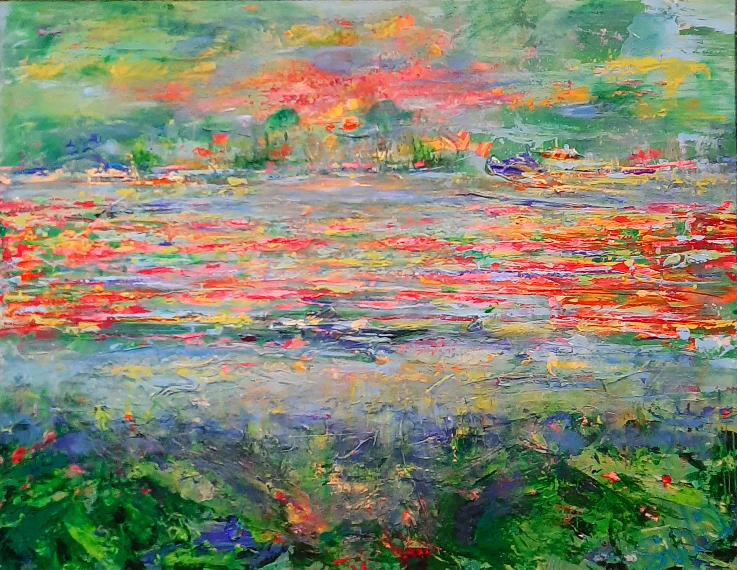 Surreeel Zee Abstract Figuratief Geel Landschap Blauw Groen Bloemen Water Roze Appelgroen Lichtblauw Vrolijk Zonnig Landscape Romantisch Droom Impressionisme Meer Monet Kerst Droombeeld Kerstkaart Dream