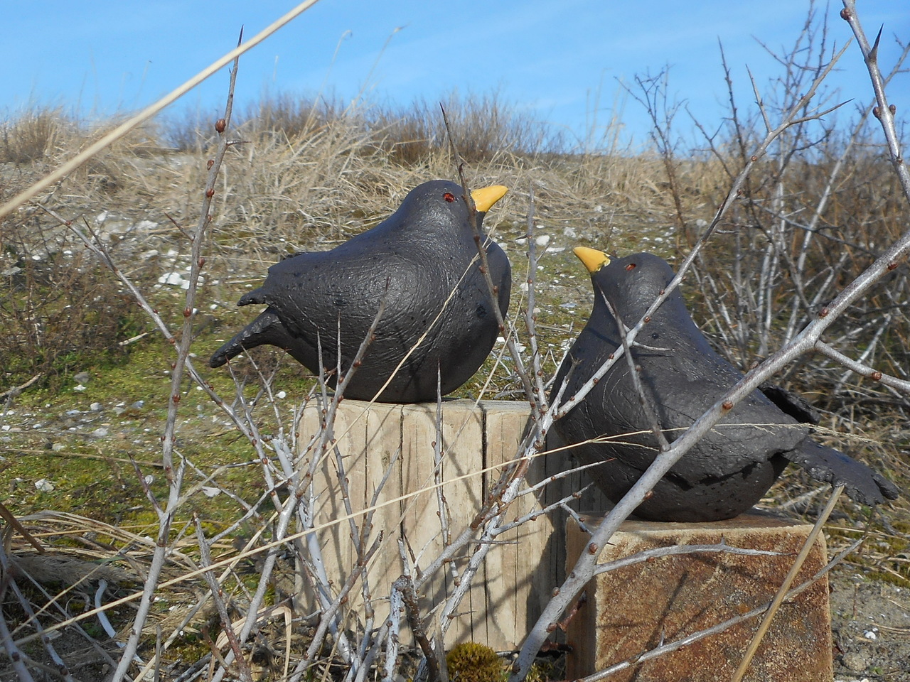Merels op houten sokkel....handvorm, bewerkt met engobes en glazuur.