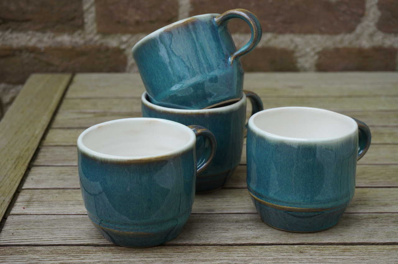 Set van vier mokjes. Gedraaid van witte klei, groen geglazuurd.