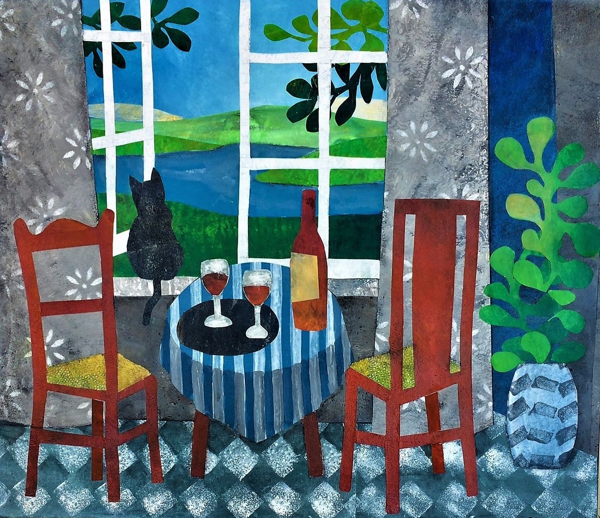 Acryl Kleurig Canvas Kat Doek Op Collage Venster Gezellig Raam Huiskamer Uitzicht Wijntje