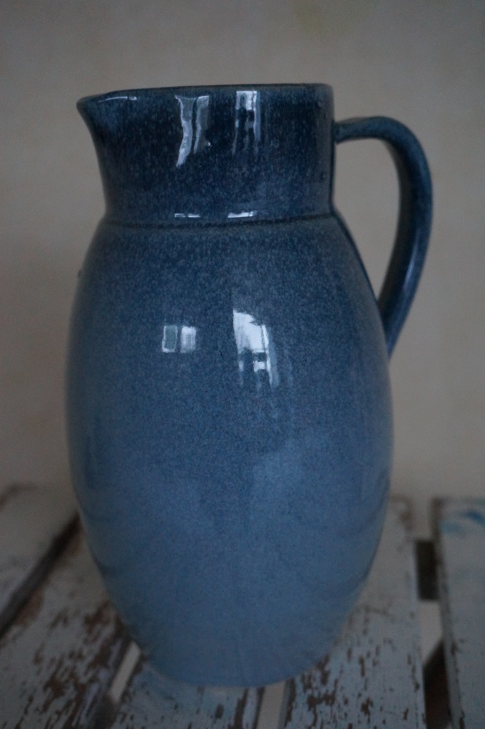 Schenkkan met oor, Gedraaid met wite klei, voorzien van lichtblauw, en aan de bovenkant donkerblauw glazuur.