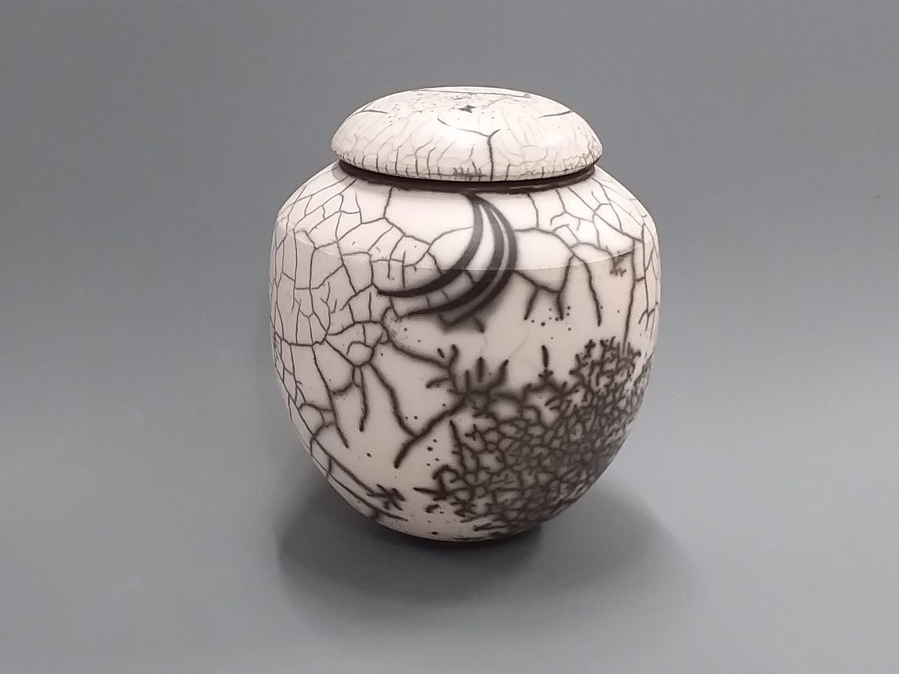 Urn van porselein.Gedraaid op de schijf. Mooie tekening van de rooksporen. De inhoud is 1 1/2 liter.