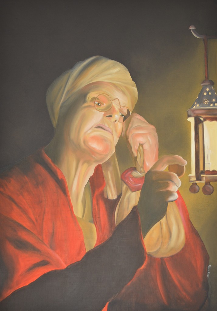 Bijgelicht door een lantaarn, onderzoekt de oude vrouw een munt. In haar linkerhand houdt ze een buidel vol met andere geldstukken. Geïnspireerd door Gerard van Honthorst’s ‘Oude Vrouw onderzoekt een munt’