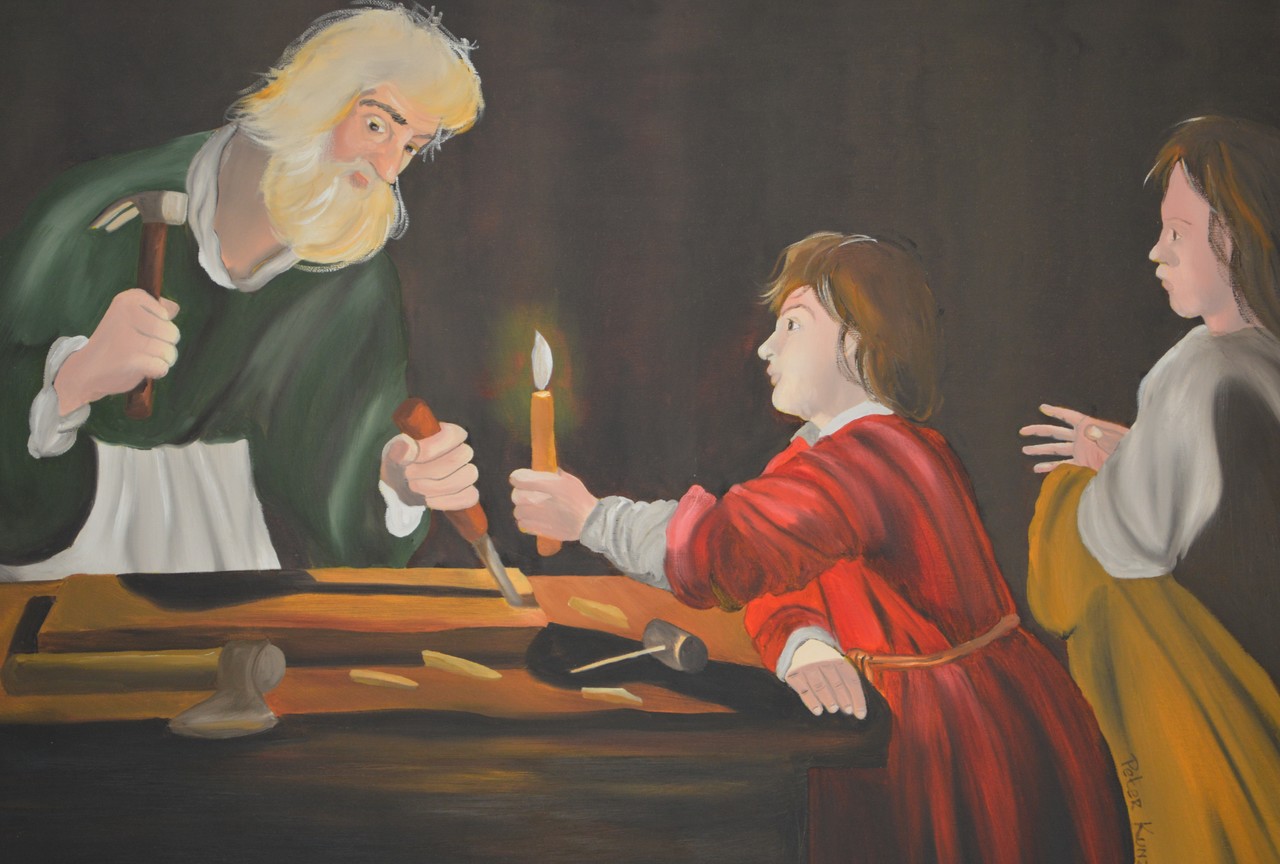 Een jonge Jezus licht zijn aardse vader bij in diens werkplaats. Geïnspireerd door Gerard van Honthorst