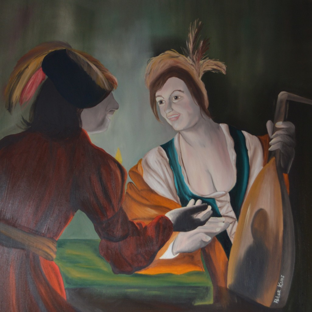 Vrouw met luit in haar hand. De man probeert haar duidelijk ergens van te overtuigen. Wat kan dat zijn … Geïnspireerd door Gerard van Honthorst