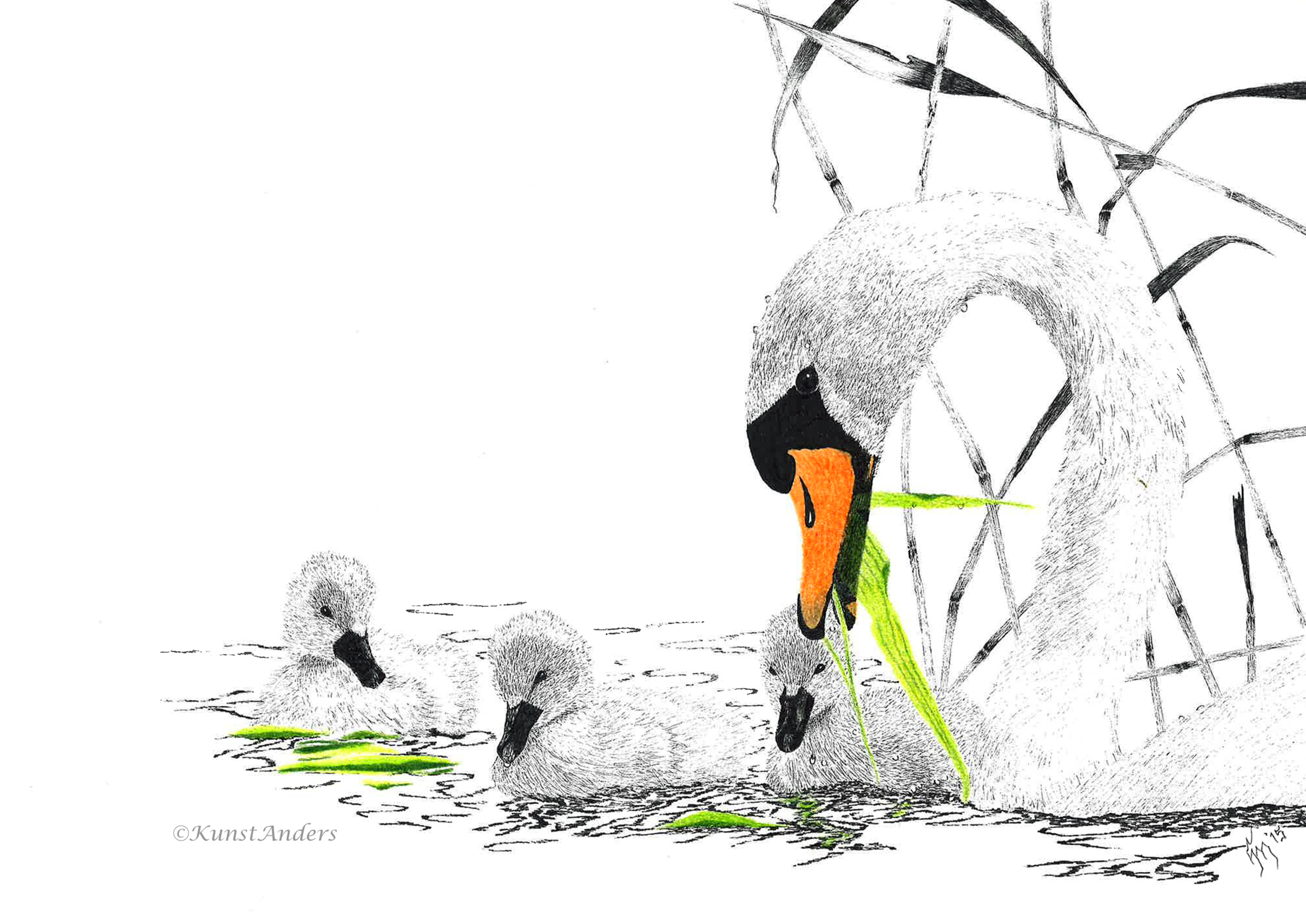 Wildlife Dieren Natuur Geboorte Zwaan Vogels Pentekening Felicitatie Kunstanders