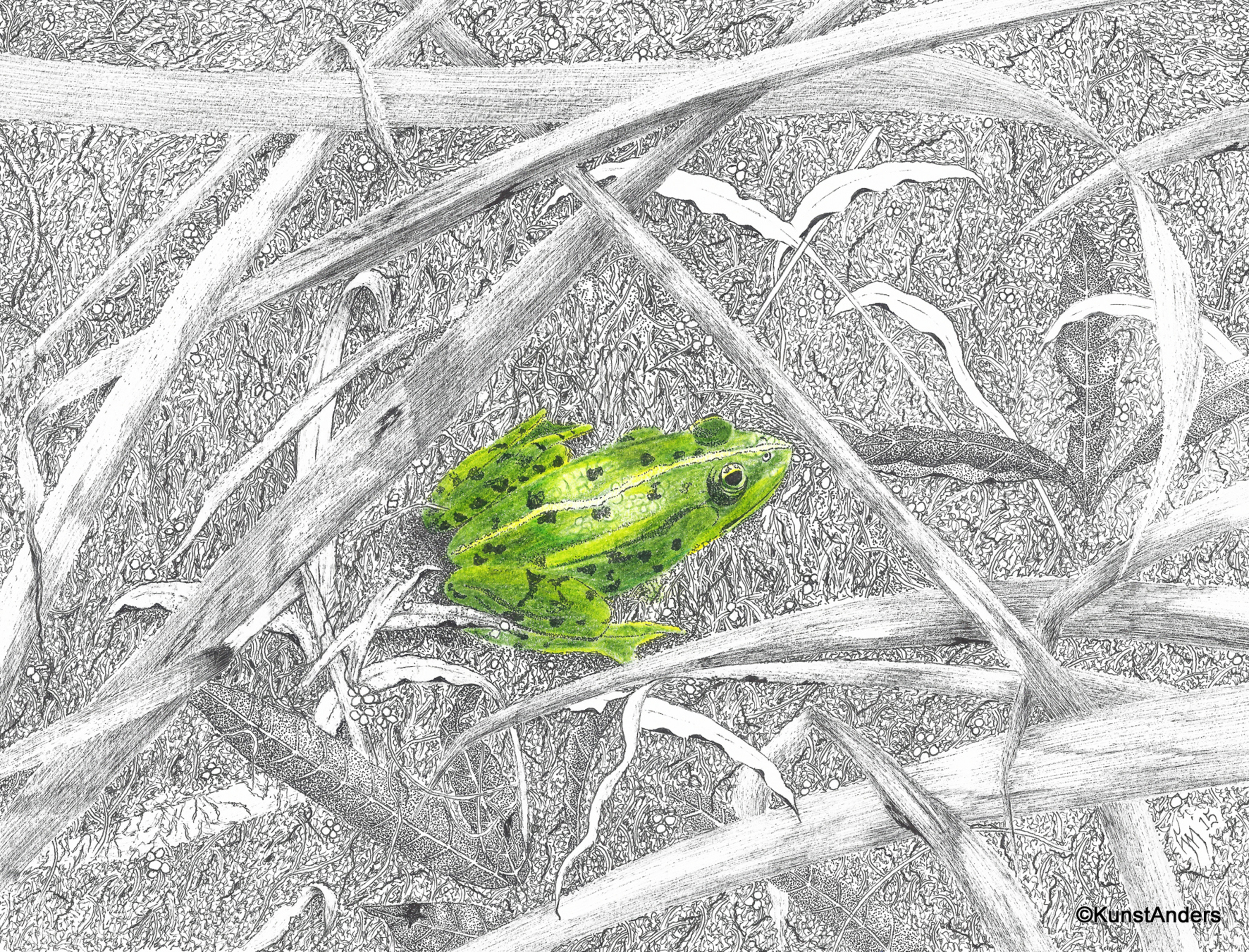 Deze tekening is gemaakt nadat wij tijdens de Open Tuindagen een bezoekje hadden gebracht aan het prachtige landgoed Jorissenhoeve in Schijf. We konden deze mooie groene kikker ‘betrappen’ toen hij net een zonnebadje nam tussen de waterplanten.