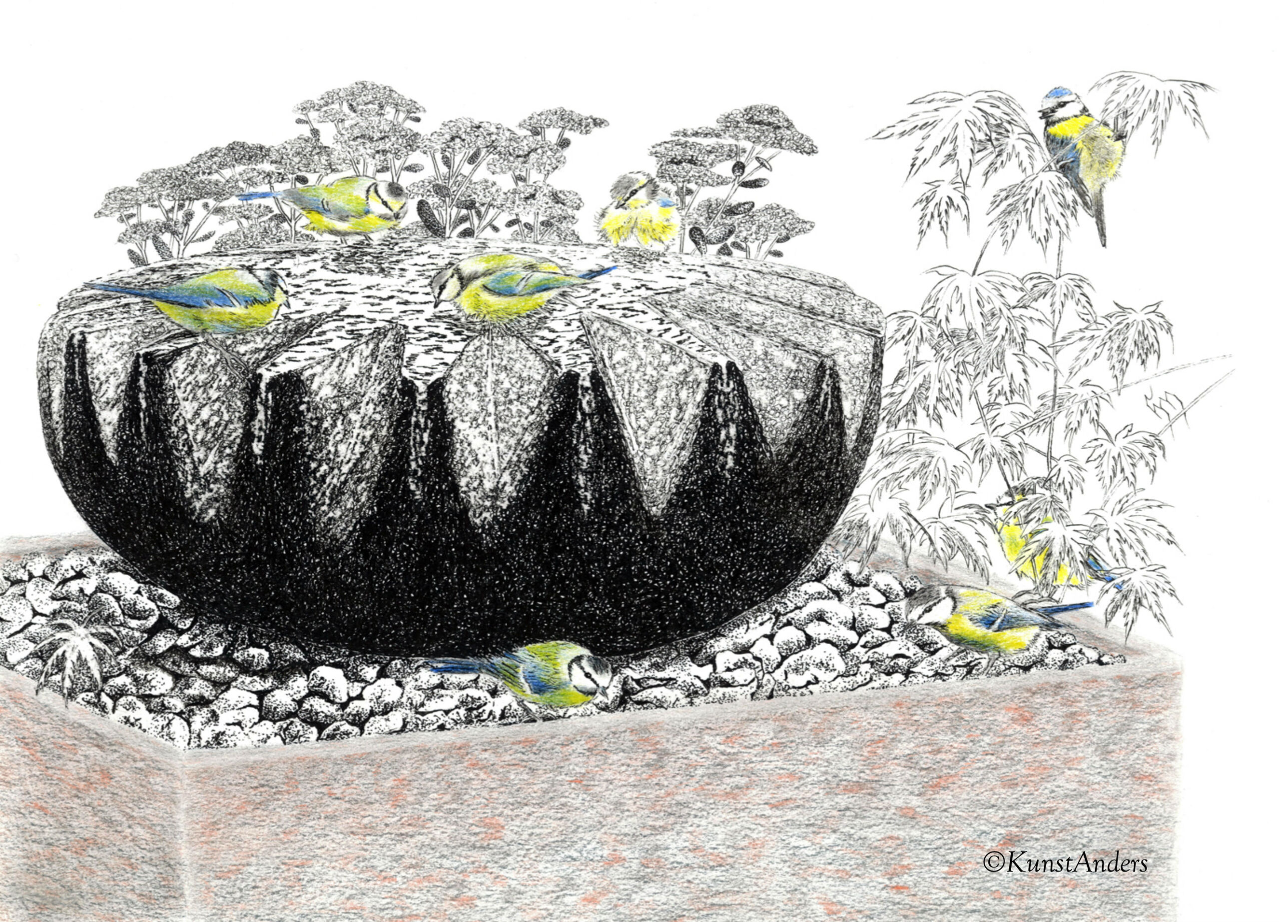 En dit was zomaar een cadeautje dat ik 's zomers in mijn eigen achtertuin kon aantreffen: een hele familie pimpelmezen, vader, moeder en jonkies die uitgebreid kwamen badderen in ons waterornament. Soms kwamen ze met zoveel tegelijk dat ze eerst in de acer neerstreken om netjes hun beurt af te wachten, bekijk het filmpje en geniet van hun badritueel.....