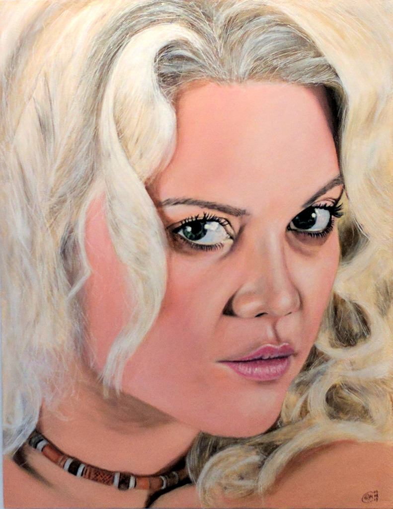 XXl portret in kleur op 18 mm multiplex paneel met afgeschuinde kanten en gemonteerd op een witte achtergrond van 80x60 cm met aluminium lijst.
