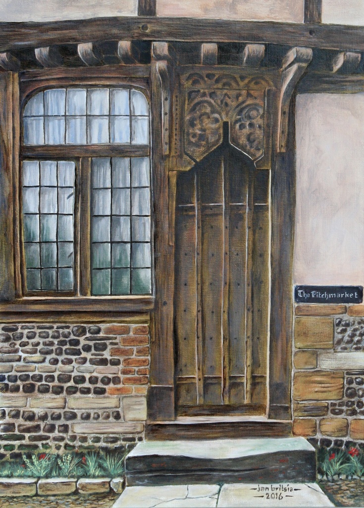 Dit schilderij geeft een eeuwenoude gevel weer in het kleine plaatsje Cerne Abbes in Dorcet, Zuid-Engeland. Jan is er al jaren eerder op bezoek geweest. Een "Pitchmarket" is de plaats waar vroeger de zakken met graan uitgestald werden voor de verkoop. Het schilderij is gemaakt in olieverf op paneel met marouflage, opgebouwd in dunne laagjes.