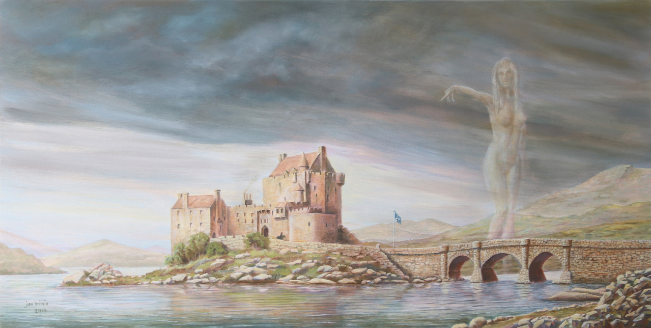 Een Kelpie komt voort uit de sagen en verhalen die Schotland zo talrijk zijn, Het is een watergeest die het meestal op mensen heeft gemunt met als doel hen het water in te lokken en te verdrinken, Een Kelpie kan daarvoor een gedaante aannemen, vaak is dat een paard maar ook de gedaante ven een verleidelijke vrouw is geliefd. Jan heeft op dit schilderij de Kelpie geplaatst in het decor van Eilean Donan Castle, in het noord-westen van Schotland op een schiereiland van Locch Duich. Is de ruiter die het kasteel verlaat, bestand tegen de verleidingen van het water of verdrinkt hij door toedoen van de geest?