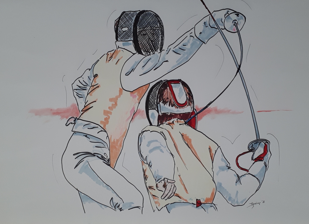 Georges Dérop, kunstschilder met als thema Sport en bewegen. Gefascineerd door het schermen van vroeger tot nu. De spanning die uitgaat van om dat ene moment op doek te zetten inspireert mij. Maar ook de natuur in al zijn pracht en glorie zet ik graag op het doek. Speciaal onderwerp is de geschiedenis van het zwaard. van actie tot en met stilleven, van Romeinen tot heden. En verder maak ik portretten van mijn familie en teken ik dieren en vogels uit de wildernis alsmede huis dieren