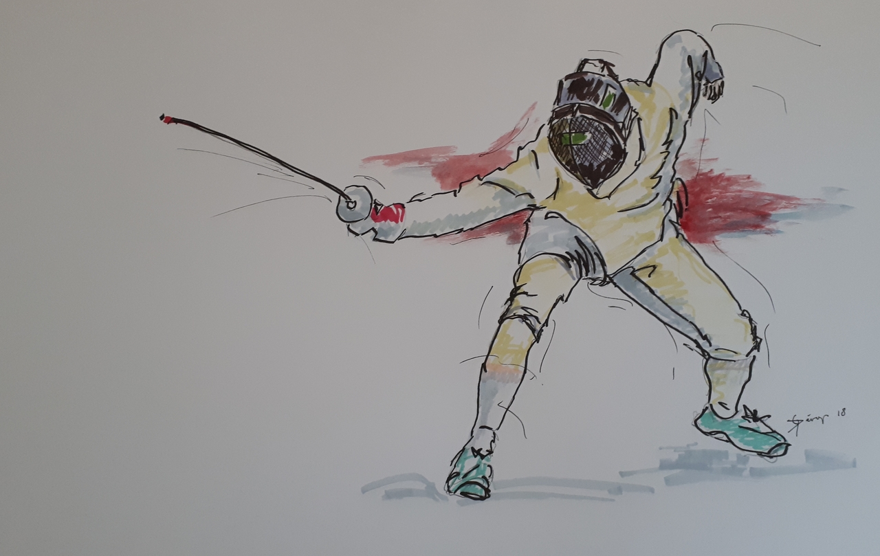 Georges Dérop, kunstschilder met als thema Sport en bewegen. Gefascineerd door het schermen van vroeger tot nu. De spanning die uitgaat van om dat ene moment op doek te zetten inspireert mij. Maar ook de natuur in al zijn pracht en glorie zet ik graag op het doek. Speciaal onderwerp is de geschiedenis van het zwaard. van actie tot en met stilleven, van Romeinen tot heden. En verder maak ik portretten van mijn familie en teken ik dieren en vogels uit de wildernis alsmede huis dieren