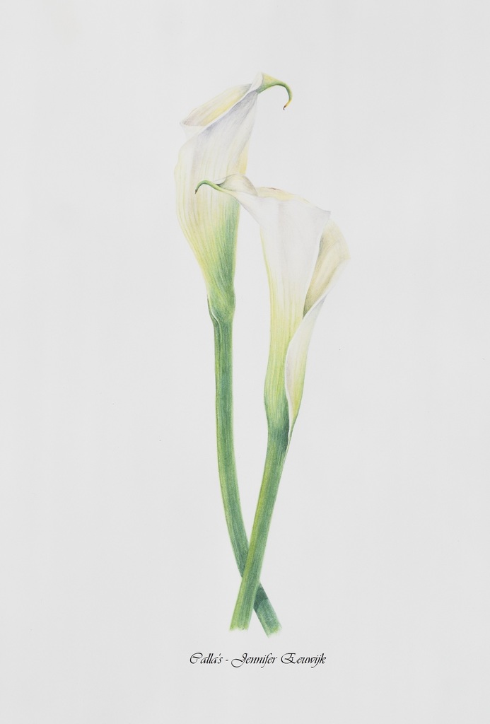 Botanische weergave van wiite calla's. Geschilderd in aquarel.