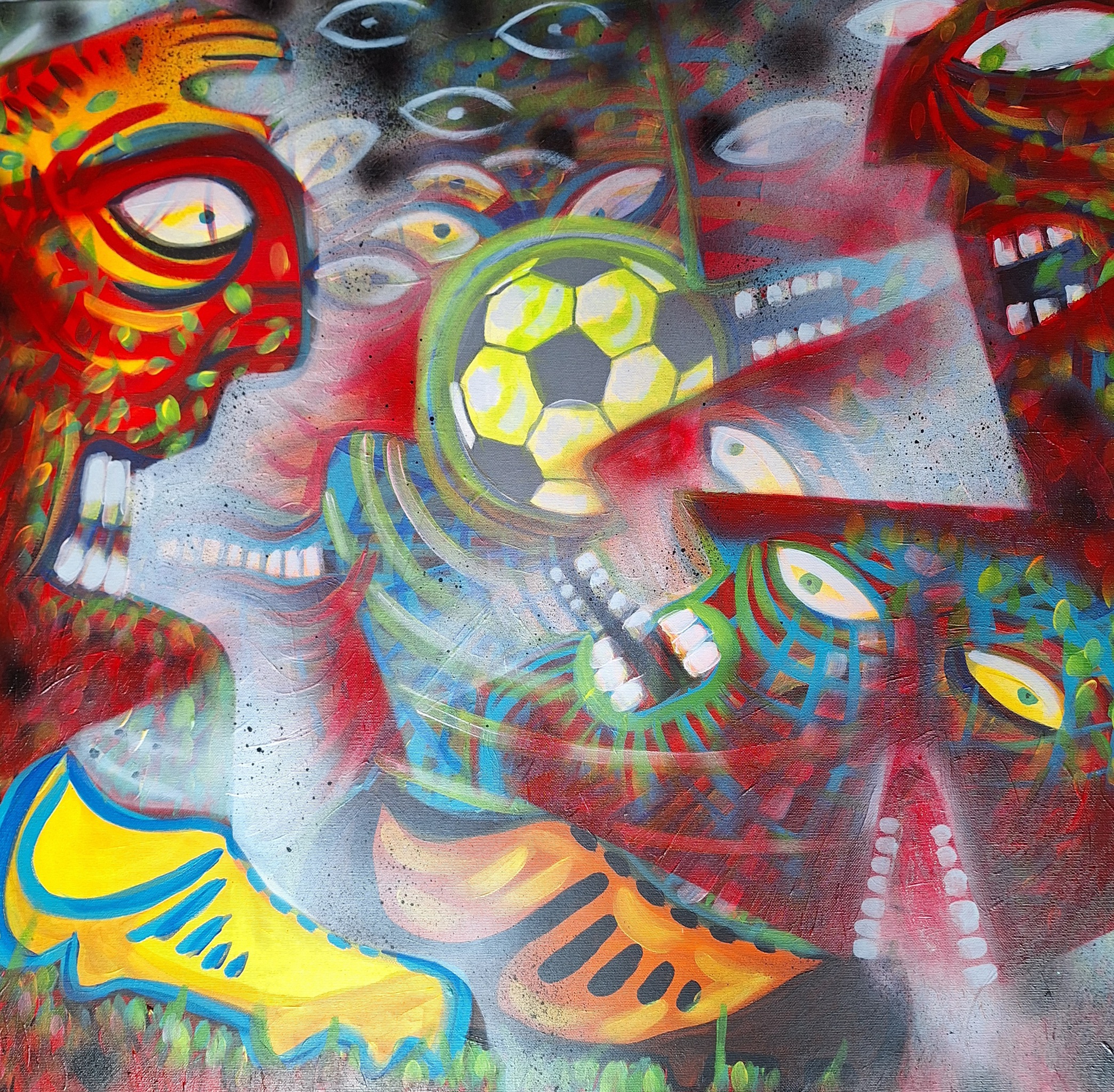 Acrylverf op canvas. 70x70cm. In 2017 is gestart met het schilderij en het is in 2019 afgemaakt. Cobra stijl. In dit schilderij de voetbal centraal. Er is een strijd om de bal gaande.