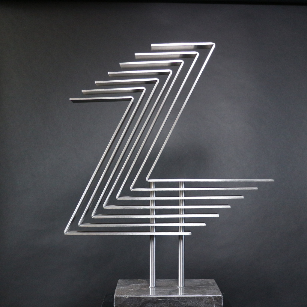 De serie Rhythm is gemaakt met het idee het gevoel van ritme zo strak mogelijk weer te geven en gebruik te maken van RVS strips. De strips zijn 5 cm breed en 4 mm dik. Het geheel is met behulp van RVS draadend, buis en moeren bevestigd op een hardstenen sokkel. Het kan zonder meer buiten geplaatst worden.