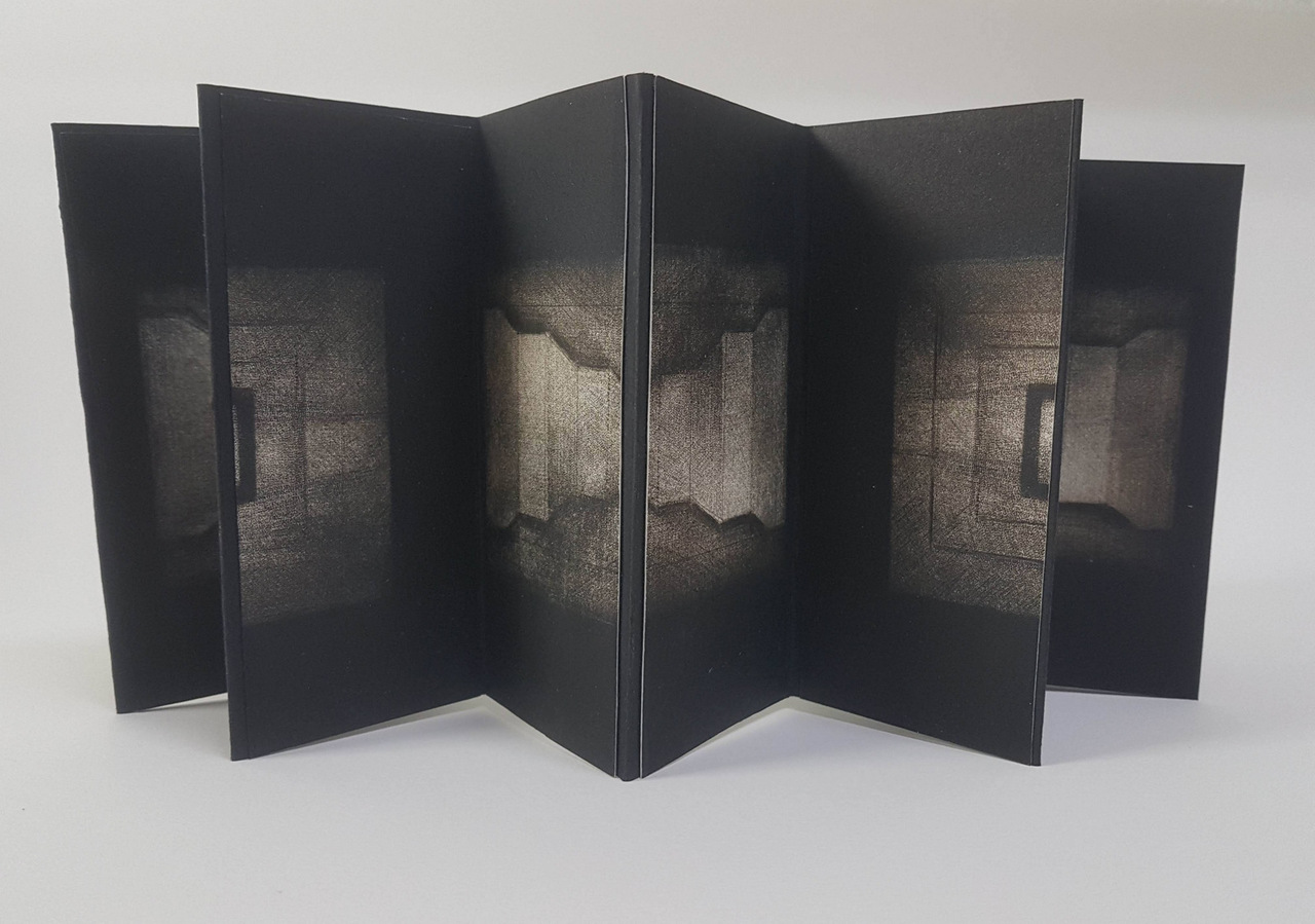 Artistbook. Kunstenaarsboekje, gemaakt tijdens mijn fellowship aan de Grafische werkplaats in Venetie. Leporello, harde cover. het boekje is gemaakt van mezzotinten die versneden zijn tot nieuwe beelden. Een manier om leterlijk ruimte in het werk te krijgen. Lengte wanneer helemaal open 105cm.