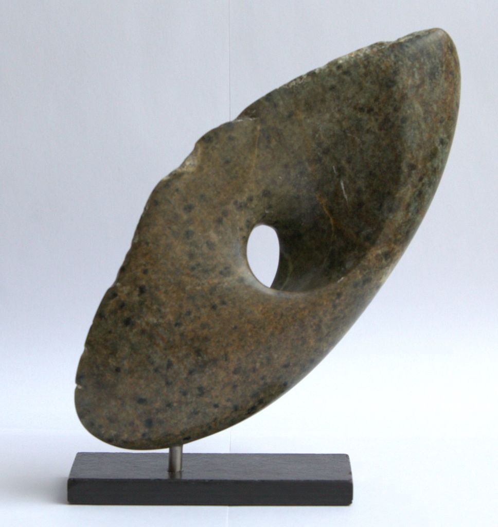 Schulpengat is gemaakt van speksteen en geplaatst op een sokkel van leisteen.