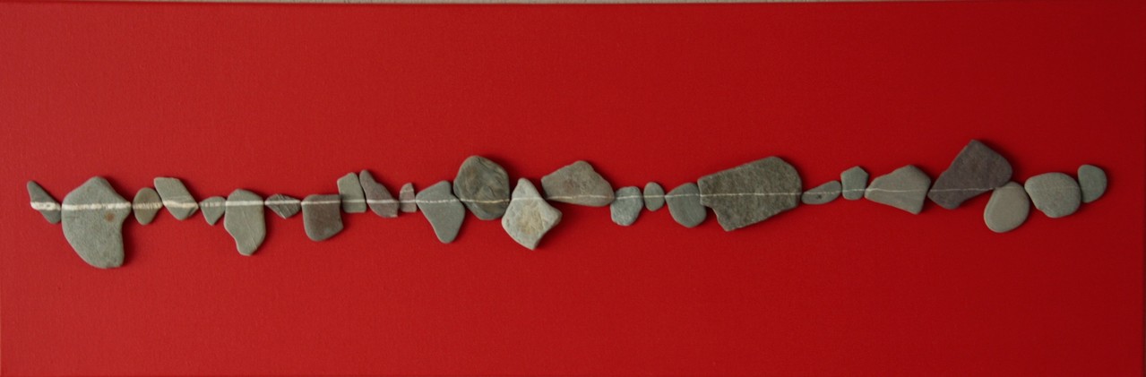 Een streep gevormd van steentjes met een marmer lijntje. Met een rode achtergrond