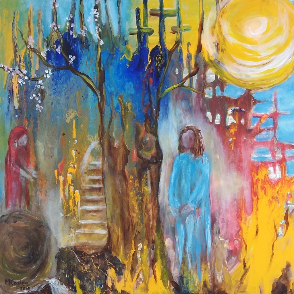 Een verbeelding van het Paasverhaal. 3D doek met meegeschilderde zijkanten. Kan zonder lijst zo worden opgehangen.