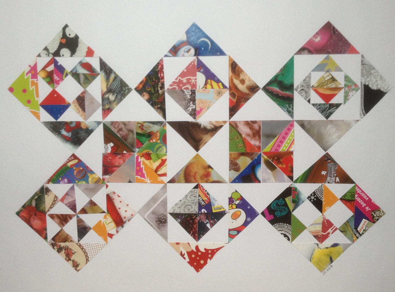 Kunst van hergebruikte materialen. Collage van stukjes ontvangen kerstkaarten. Op wit papier, ingelijst achter glas, in tweedehands lijst.