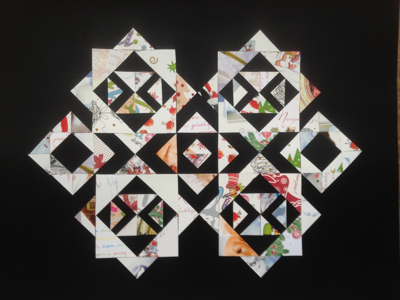 Kunst van hergebruikte materialen. Collage van stukjes ontvangen kerstkaarten. Op zwart papier, ingelijst achter glas. In tweedehands lijst.