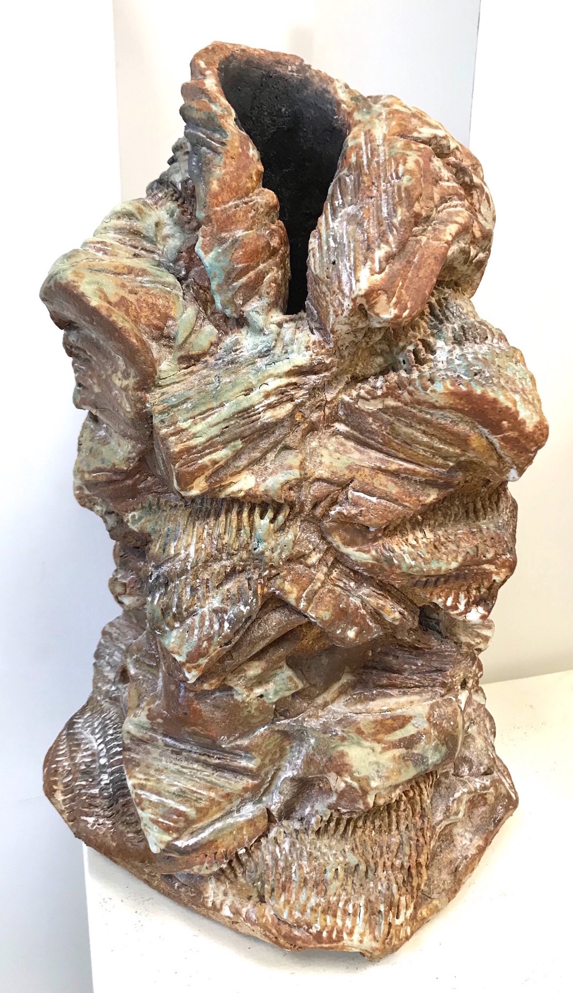 Abstract beeld van klei. Glazuren: reactieve slibs (o.a. barium) en oxydes, as. Het beeld is hooggestookt, d.w.z. dat het evt ook buiten kan staan. Kleuren bruin groen rood wit beige.