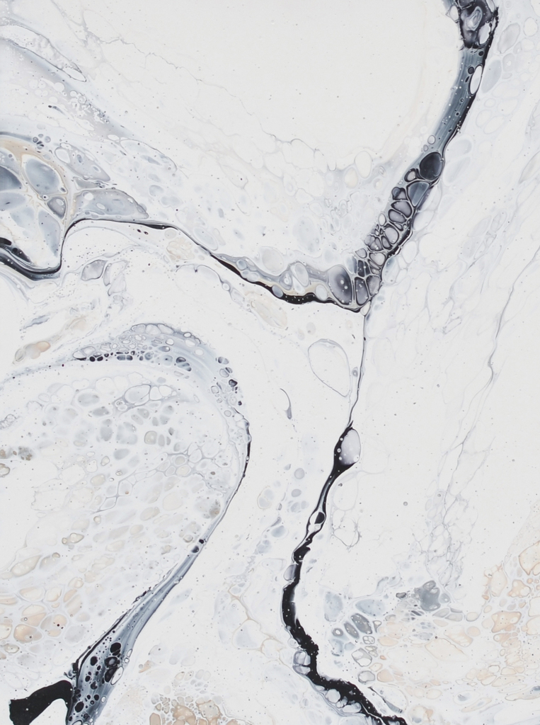 Dit werk geeft je het gevoel van een doorgaande beweging, het stroomt, borrelt en beweegt. De zachte grijstonen en geleidelijke overgangen geven een dynamisch geheel maar door de afwezigheid van kleir straalt dit werk toch rust uit. Dit werk past mooi op een donkere ondergrond of een gekleurde muur.