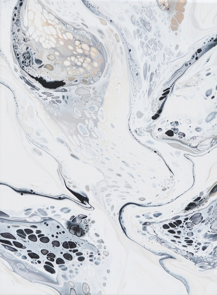 Dit werk geeft je het gevoel van een doorgaande beweging, het stroomt, borrelt en beweegt. De zachte grijstonen en geleidelijke overgangen geven een dynamisch geheel maar door de afwezigheid van kleir straalt dit werk toch rust uit. Dit werk past mooi op een donkere ondergrond of een gekleurde muur.