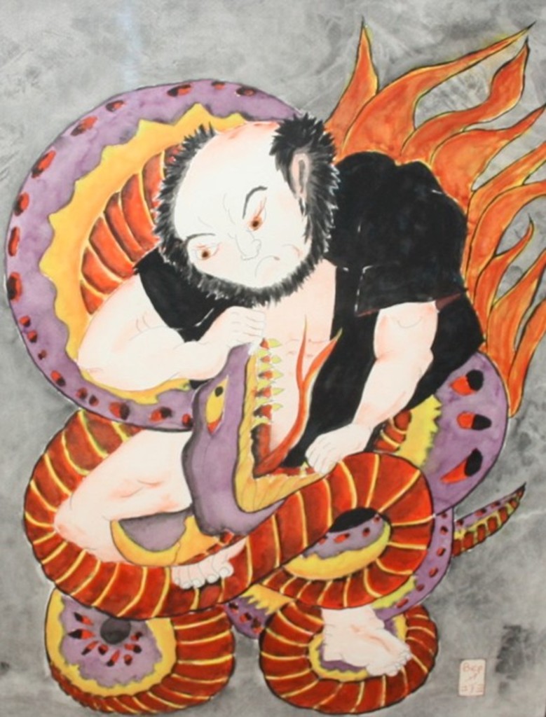 Schilderij van een Japanse retro tatouage Titel Slangengevecht