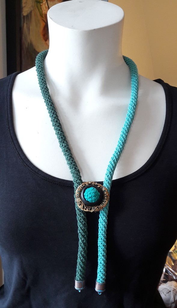 Bauw turkois koord, met een medaillon van messing draad en houten ring en koperen uiteinden.