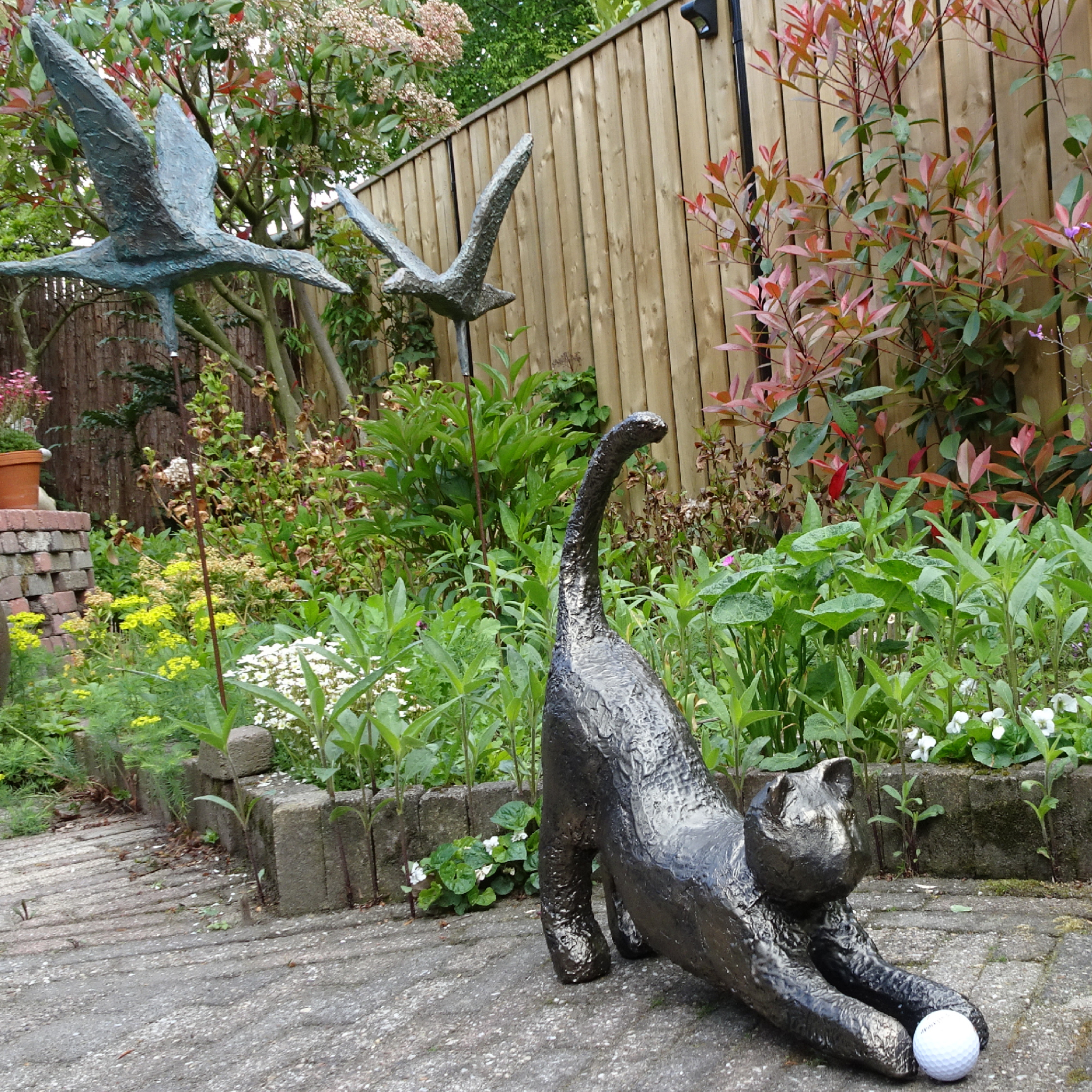 Kat. Gemaakt van kunsthars en afgewerkt in bronskleur. Kan op 2 manieren worden neergezet. Liggend en zittend.