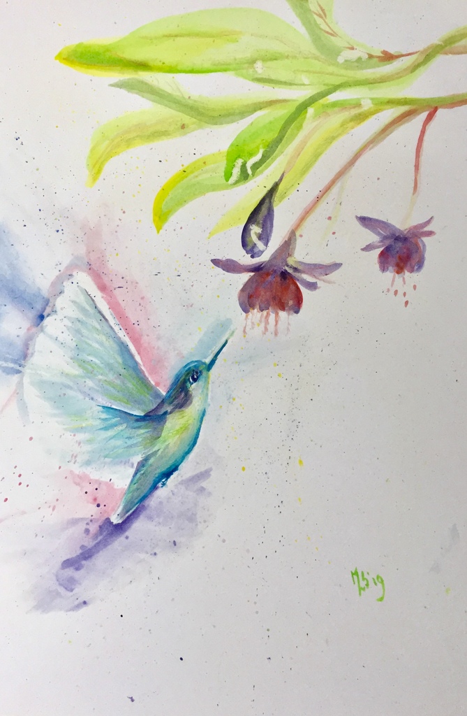 Aquarel waarin de kleurige snelheid van het vogeltje de kolibri van afspat